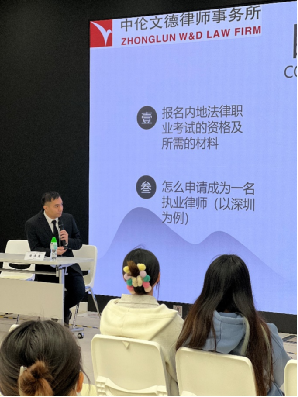 北京市中倫文德(深圳)律師事務所律師陳海龐先生首先詳細講解了報名內地法律職業考試的資格及所需材料;其後以自身為例分別給同學們講解了怎麼申請成為實習律師和執業律師;並鼓勵同學們要多與師兄姐交流和學習。