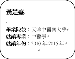 感謝我的父母,全力支持我遠赴天津,追尋我的中醫夢,我當黃醫師已經一年了。感謝我的母校──天津中醫藥大學,為我的臨床事業打了牢牢的基礎,而更重要的是老師們的言傳身教,讓我領悟「大醫精誠」的醫德風範。