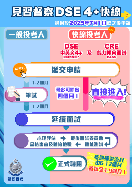 香港特別行政區政府香港警務處於七月一日推出「見習督察DSE 4+快線」。於香港中學文憑考試中國語文科和英國語文科取得第四級或以上的成績,或具同等學歷,並通過綜合招聘考試的能力傾向測試,將被視為通過見習督察筆試,可直接進入延續面試。這項措施有助加快遴選程序,讓達到上述要求的考生盡快加入警隊,加強警隊於就業市場吸引人才。