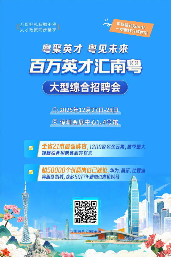 2025年12月27日-28日,「粵聚英才粵見未來」百萬英才匯南粵大型綜合招聘會在深圳會展中心1、4號館舉行,廣州300家行業龍頭企業、重點企事業單位齊聚鵬城,海量優質高薪崗位“職”等你來。