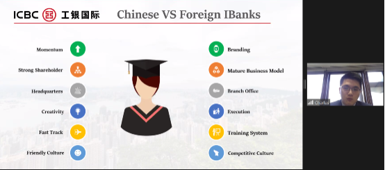 付先生首先簡要介紹了作為國際金融中心之一香港的金融行業發展現況及前景,然後以數據圖表的方式分別簡要介紹了商業銀行、投資銀行、保險公司、基金證券公司等金融機構對人才招聘過程中比較看重應聘者的地方及才能。其後講解了工銀國際的業務範圍,以及中資公司與外資公司在公司規模、決策力、創造力、執行力、業務培訓等方面的差異性。最後詳細介紹了工銀國際的人才晉升發展空間及薪酬福利等內容。當中特別提及由於今年的社會環境及新型冠狀病毒的疫情影響,工銀國際已暫停了本年度大型的實習及校園招聘活動,只維持日常業務的社會招聘活動,招聘職位信息可在工銀國際的網頁進行了解。在隨後的網上問答環節,主講嘉賓對同學們的網上提問進行解答。