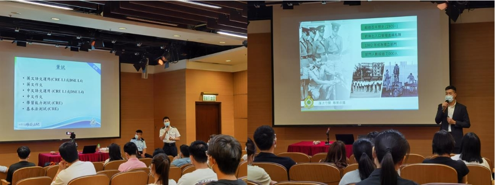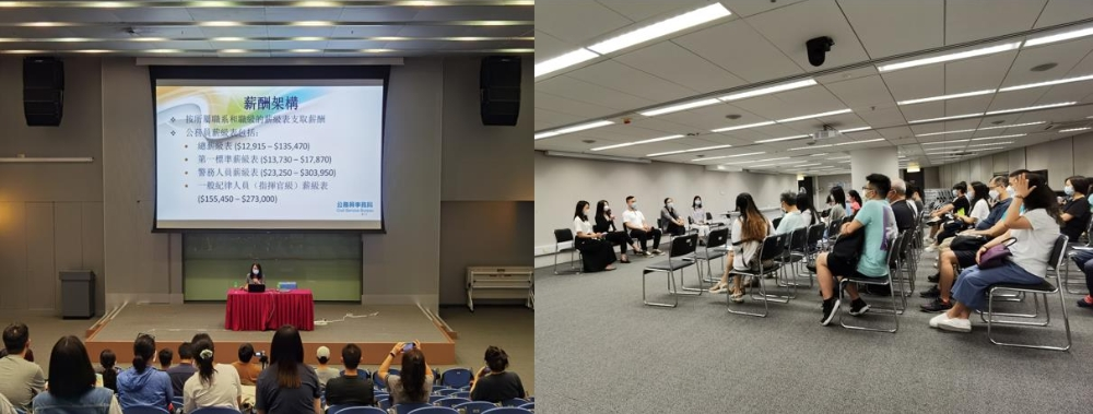 香港特區政府警務處楊永佳高級督察及懲教署黃華威懲教主任、消防處邱熠高級消防隊長、海關訓練及發展科林怡光督察、入境事務處鄧詠詩主任分別介紹了各自機構的招募程序、申請途徑、薪酬福利及職業發展等;公務員事務局黃慧儀總行政主任、梁珊娜助理秘書長及張裕瑩高級行政主任,先後介紹了香港公務員的聘任政策、程序及服務條件、政務主任職系及行政主任職系內容,並就政務主任及行政主任職位的報名資格、申請方式、工作內容及薪酬福利等資訊進行了全面說明。