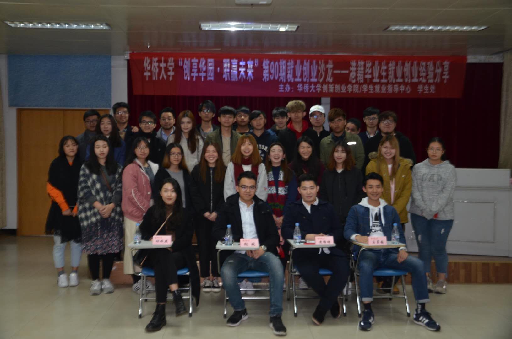3位主講嘉賓和30位華僑大學的在校港生分享了自己在學習、求職、工作等階段的經歷,並跟大家分析香港就業前景及現場互動答疑解惑。