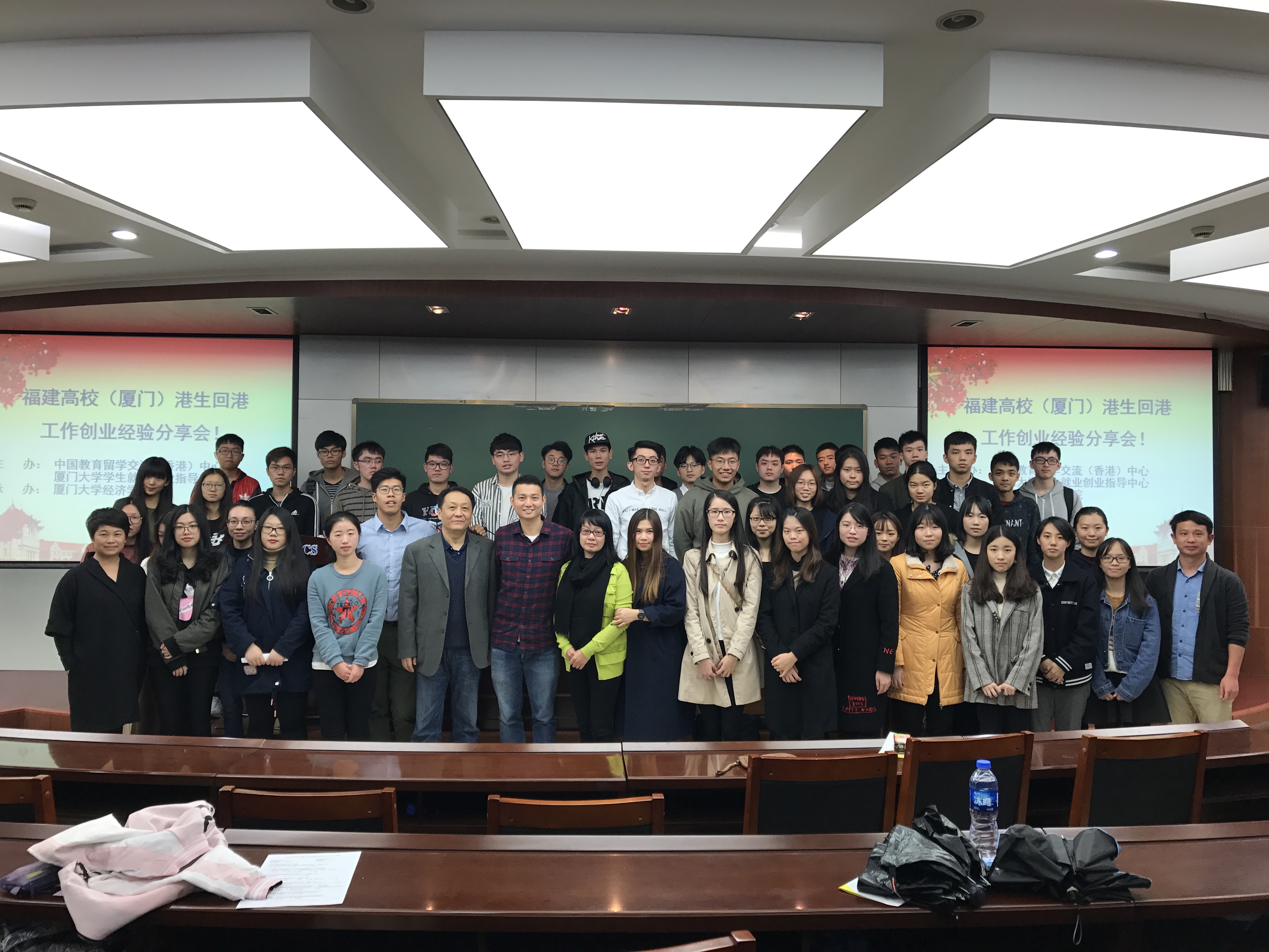 分享會在廈門大學思明校區經濟學院經濟樓N303室進行,港籍畢業生施慰鵬、王頌焜、陳絲絲作為主講嘉賓,中國教育留學交流(香港)中心和廈門大學有關負責人出席了分享會。