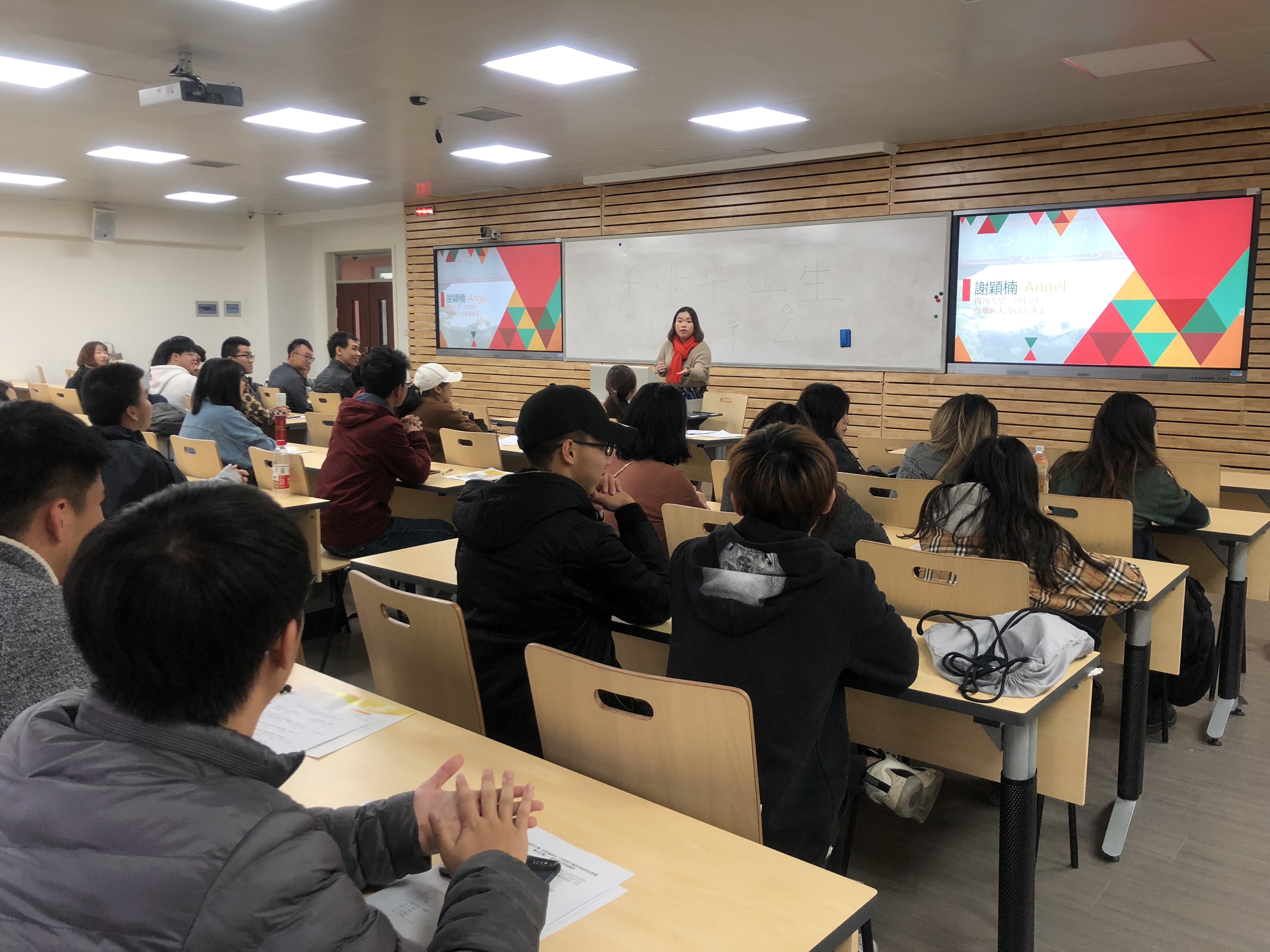 黃恩明學長首先發言,他講到:在大學三、四年級時,要多瞭解自己的興趣愛好,從而發掘適合自身的工作職業範疇。另外特別提醒畢業後計劃回到香港就業的同學們,香港部分專業行業是需要進修、考取職業考試牌照等,在學期間應早做準備。