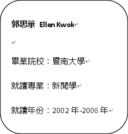 從決定攻讀暨大新聞系,直到如今畢業十二年,依然覺得大學的四年時光是人生最重要的轉折點。四年大學時光不但得到老師傾囊相授各種新聞理論、器材運用等專業知識,亦得到不少新聞採訪的實踐機會,漸漸培養起作為記者應有的膽量,為日後回港工作打好基礎。