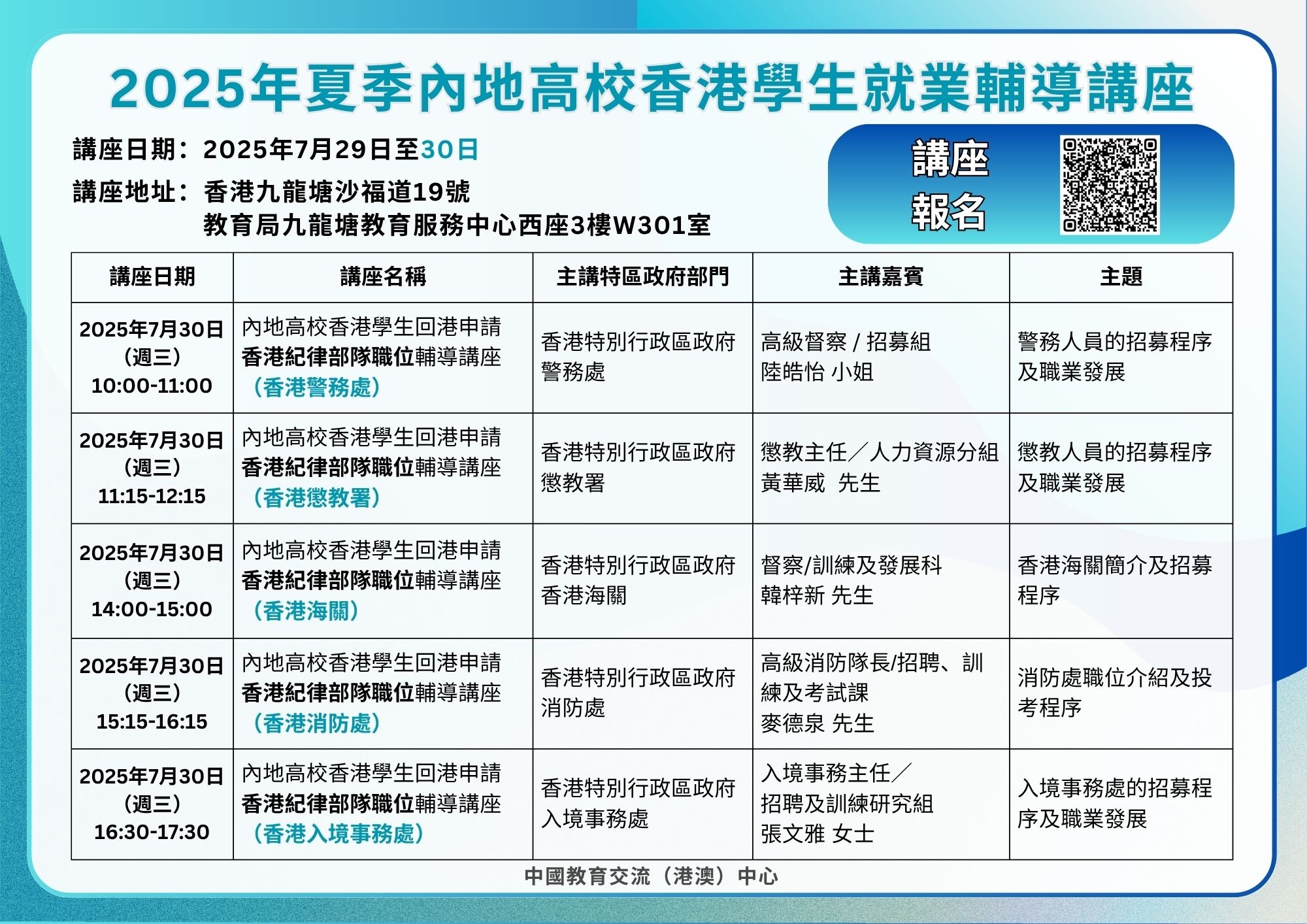 中國教育交流(港澳)中心特邀請了香港特別行政區政府公務員事務局、香港警務處、香港入境事務處、香港海關、香港消防處、香港懲教署及香港學術及職業資歷評審局代表於2025年7月29日至30日為內地高校在讀及畢業香港同學們舉辦「2025年夏季內地高校香港學生就業輔導講座」;並計劃於 2025年7月31日為內地高校香港學生首次舉辦「求職技能培訓工作坊」。屆時主講嘉賓會詳細講解內地高校香港學生回港申請香港公務員和紀律部隊職位和非本地學歷評估的資訊;以及由香港管理專業協會代表教授同學們簡歷撰寫及面試的實用技巧,並現場解答相關問題。