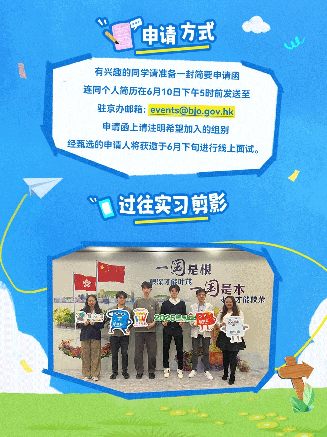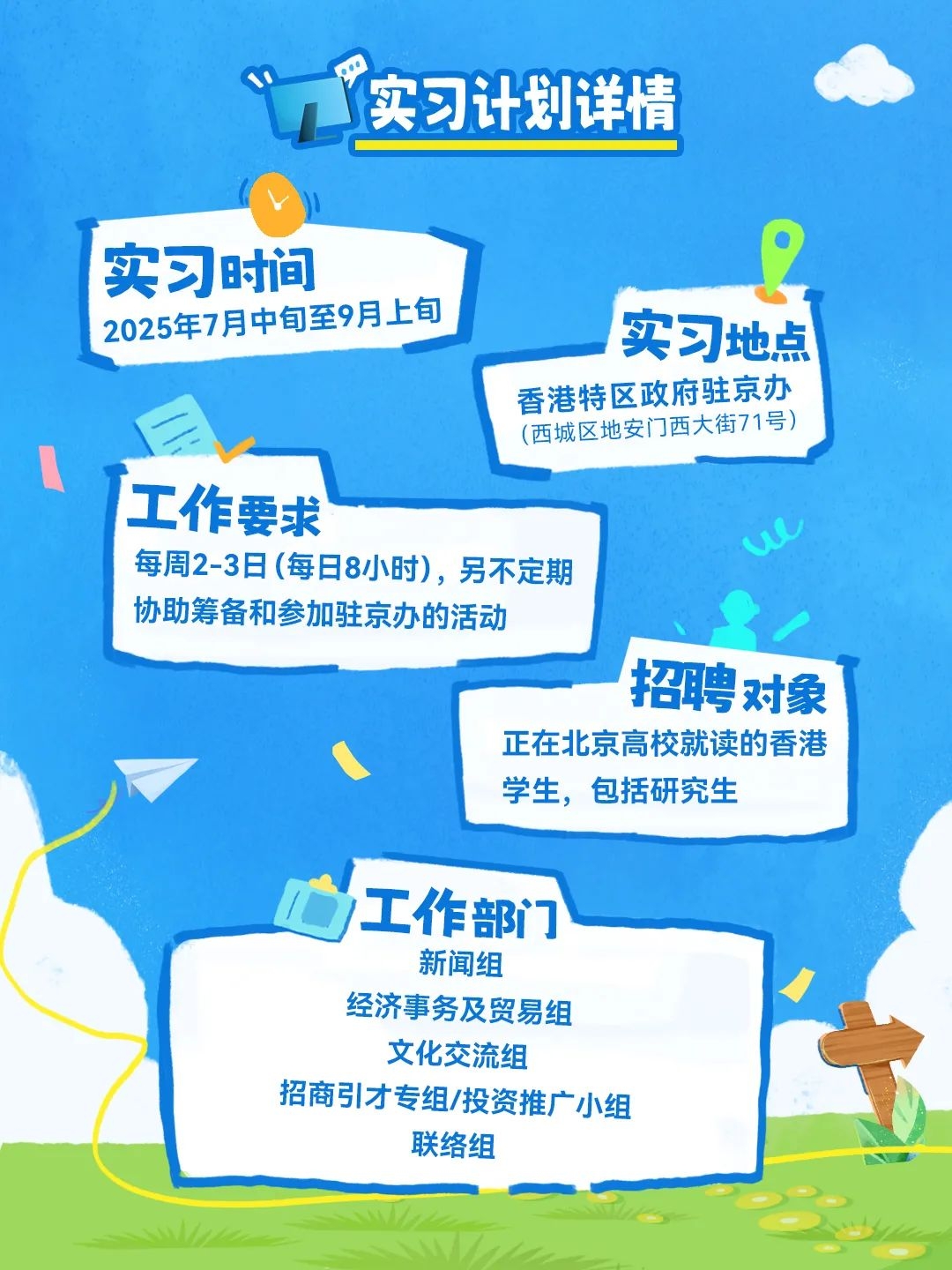 香港特區政府駐京辦擬在2025年暑期為在北京高校就讀的香港學生提供實習崗位。實習生將被分配到駐京辦不同組別工作,同時有機會參與駐京辦的活動籌備過程,在了解特區政府運作之餘,豐富閱歷和個人能力。